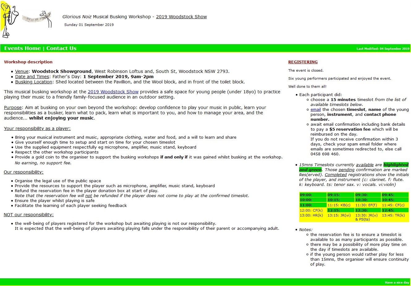 - Musical Busking Workshop at the Woodstock Show on 1 September 2019. Six participants played featuring a variety of instruments: clarinet, flute, keyboard, violin, and vocals.