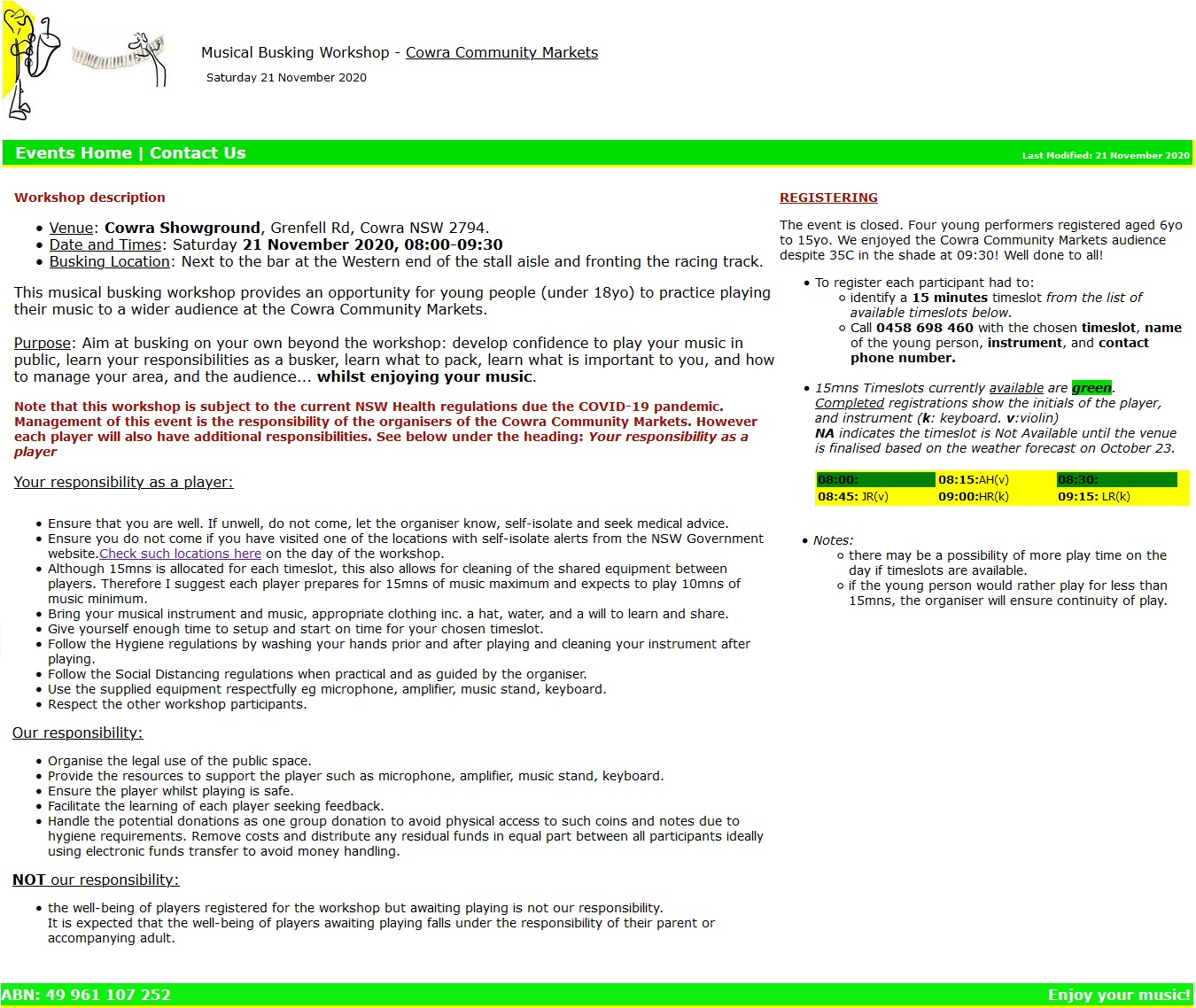 - Musical Busking Workshop at the Cowra Community Markets on 21 November 2020. Four young players registered aged 6yo to 15yo, and enjoyed the Cowra Community Markets audience despite 35C in the shade at 09:30! Well done to all!