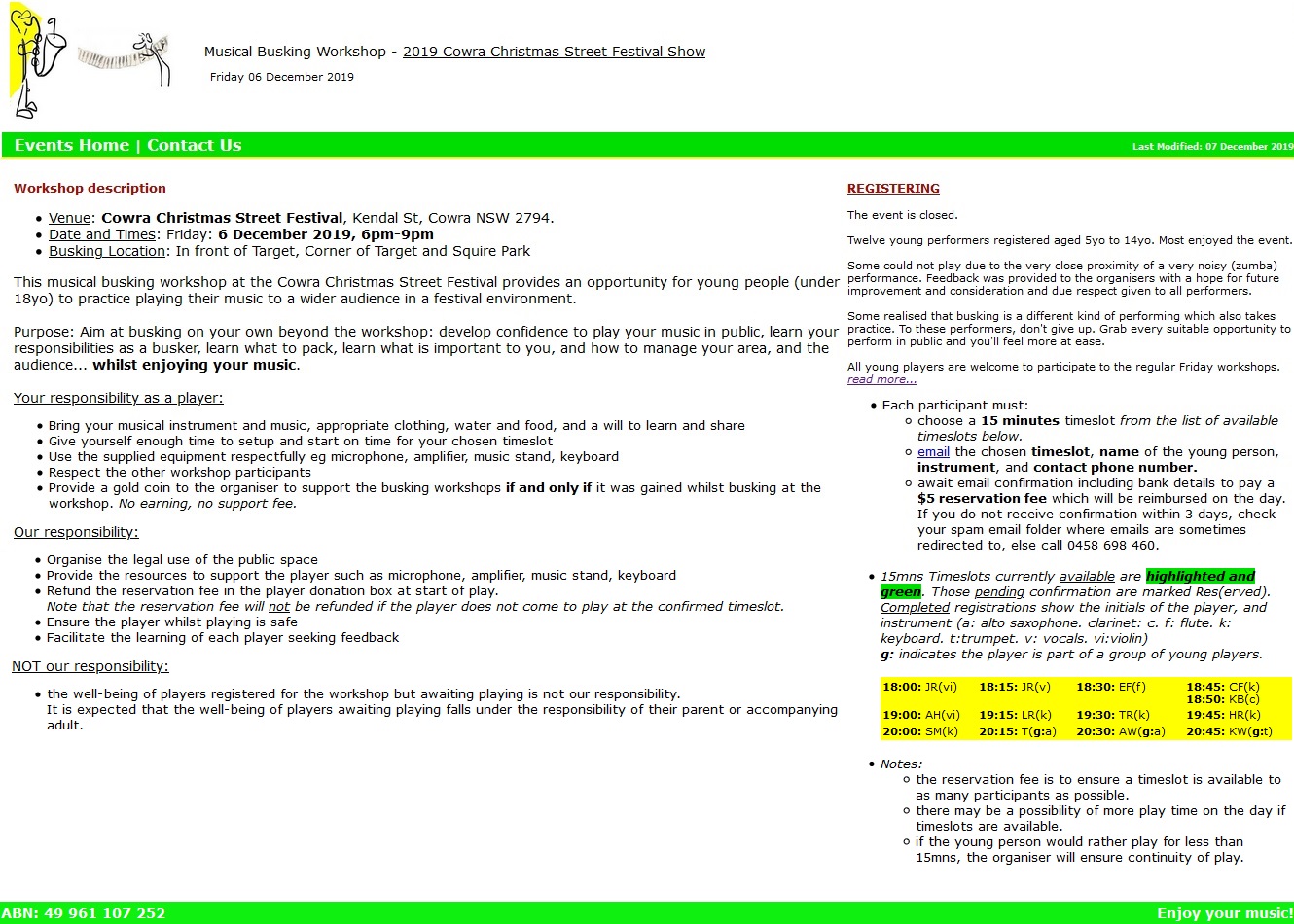 - Musical Busking Workshop at the Cowra Christmas Street Festival on 6 December 2019. Twelve young players registered. Most enjoyed it. Some competed with an unnecessary amount of competing noise. Feedback was provided to the organisers.