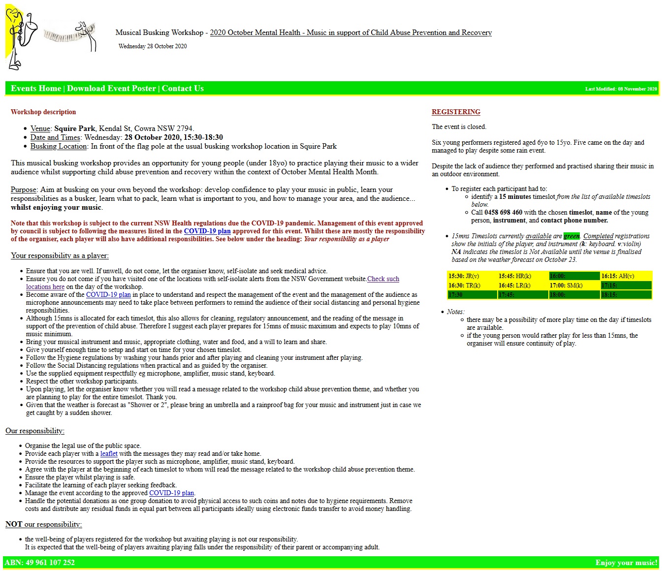 - Musical Busking Workshop at Squire Park, Cowra on 28 October 2020 in support of Child Abuse Prevention and Recovery. Five young players participated and managed to play despite rainy conditions. They were thankful for the opportunity to practice playing outdoors despite the lack of audience.