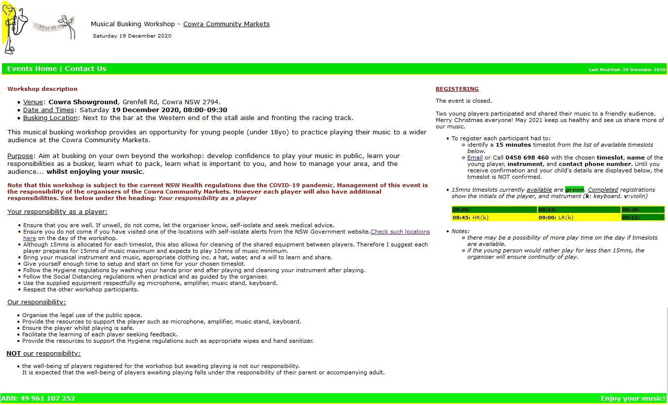 - Musical Busking Workshop at the Cowra Community Markets on 19 December 2020. Despite being close to Christmas, two young players made the time and shared their music with a friendly audience. A special effort was made to prepare some Christmas carols. Well done!